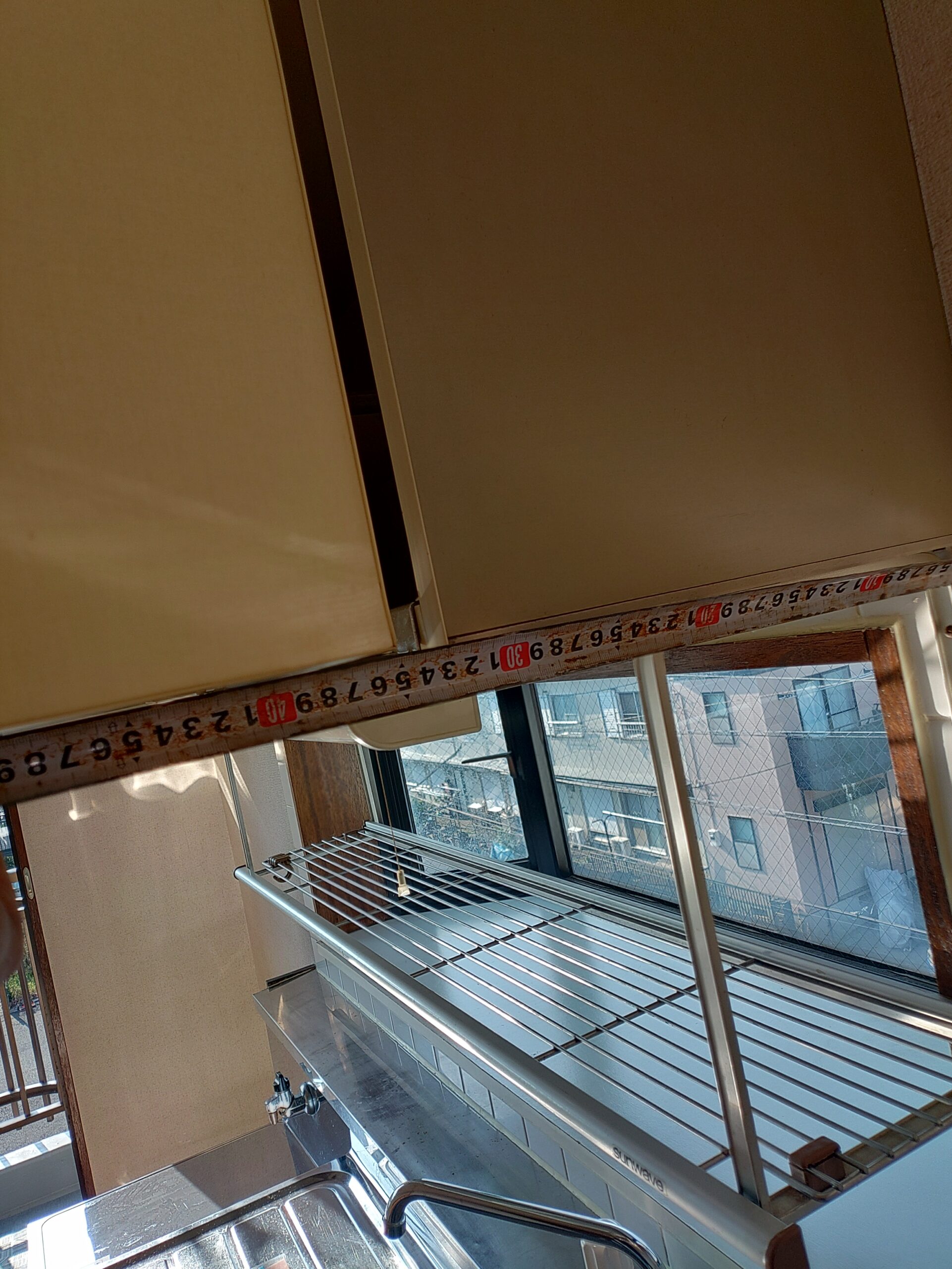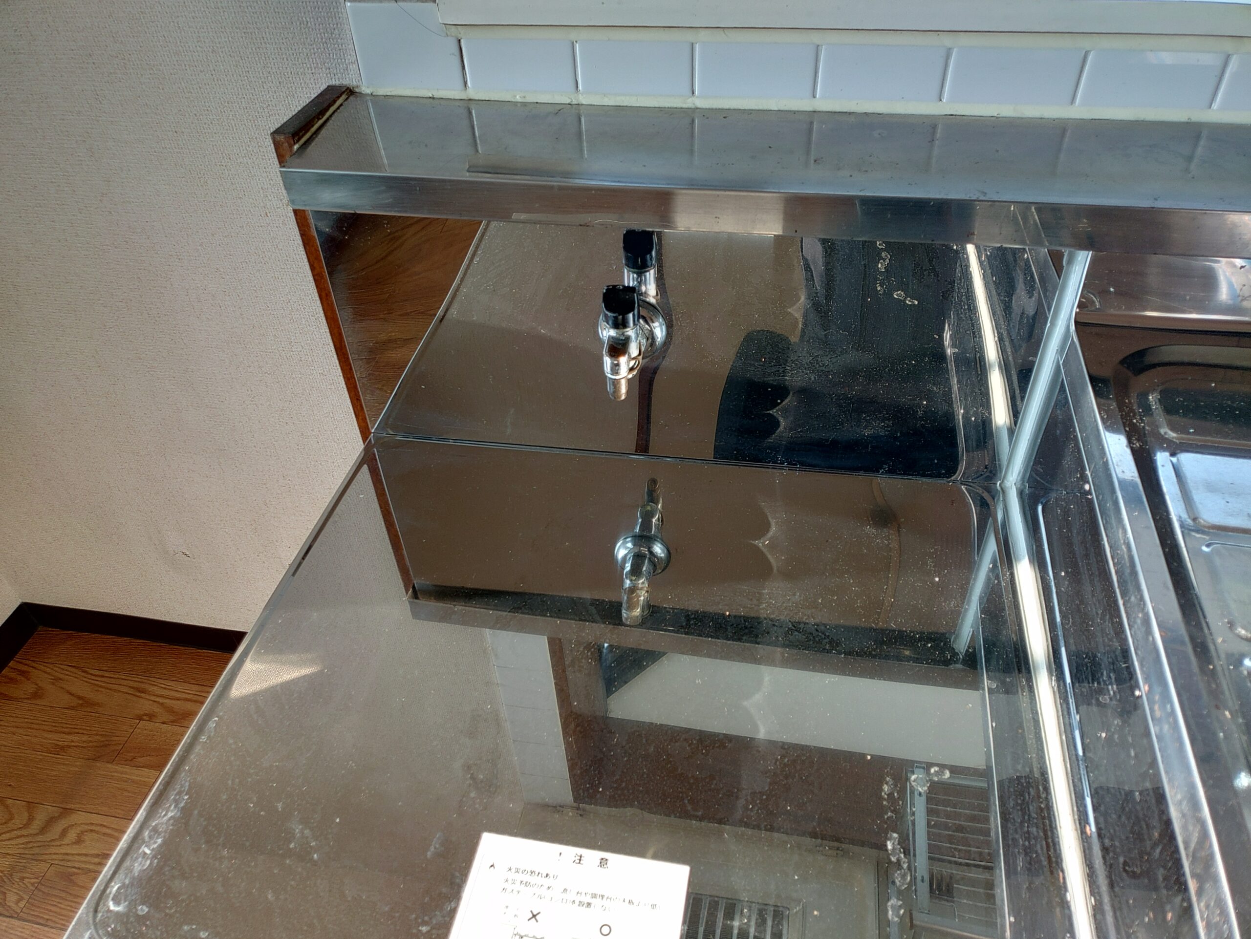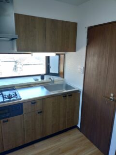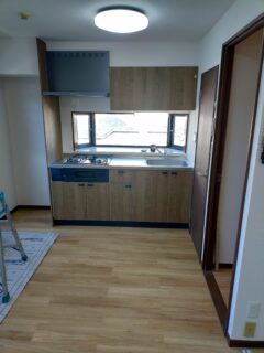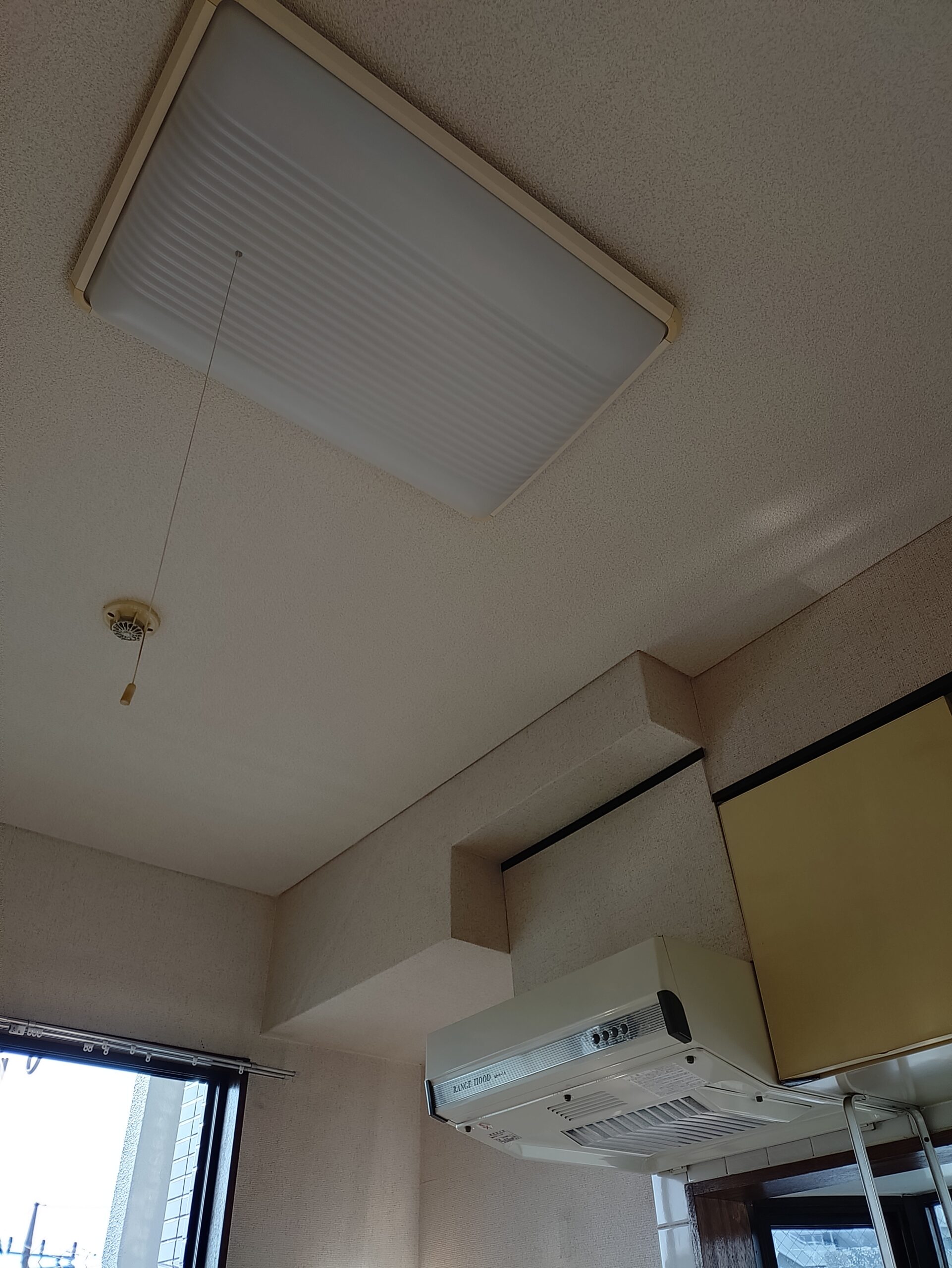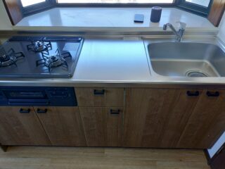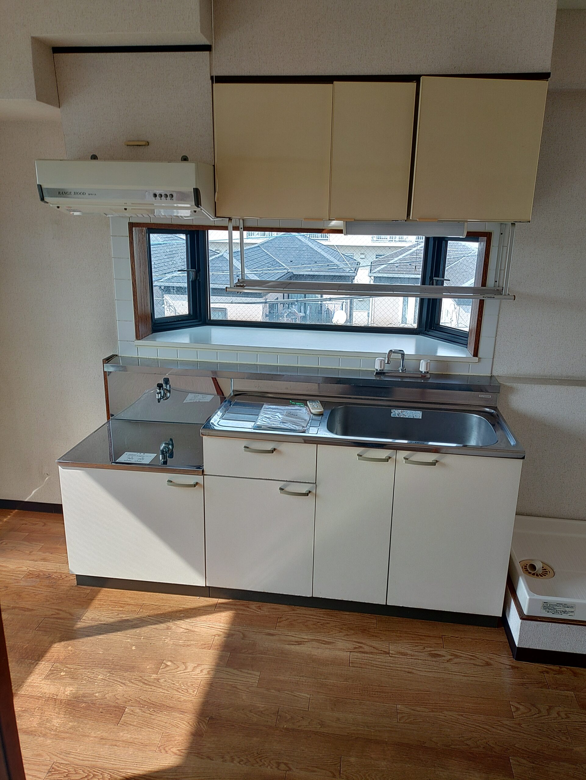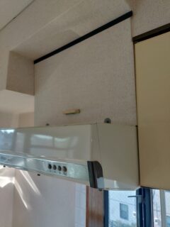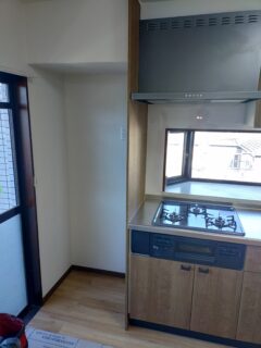 既存のキッチンは据置コンロに平型レンジフードが設置されておりました。