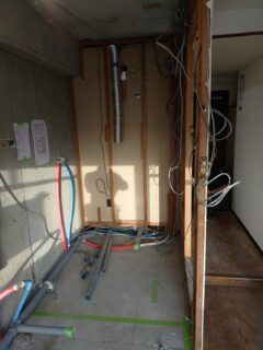 既存の浴室・既存のキッチン横スペースを解体して新しく設置する箇所に合わせて給湯管や排水管を切回ししてユニットバスを組立て設置・接続します。