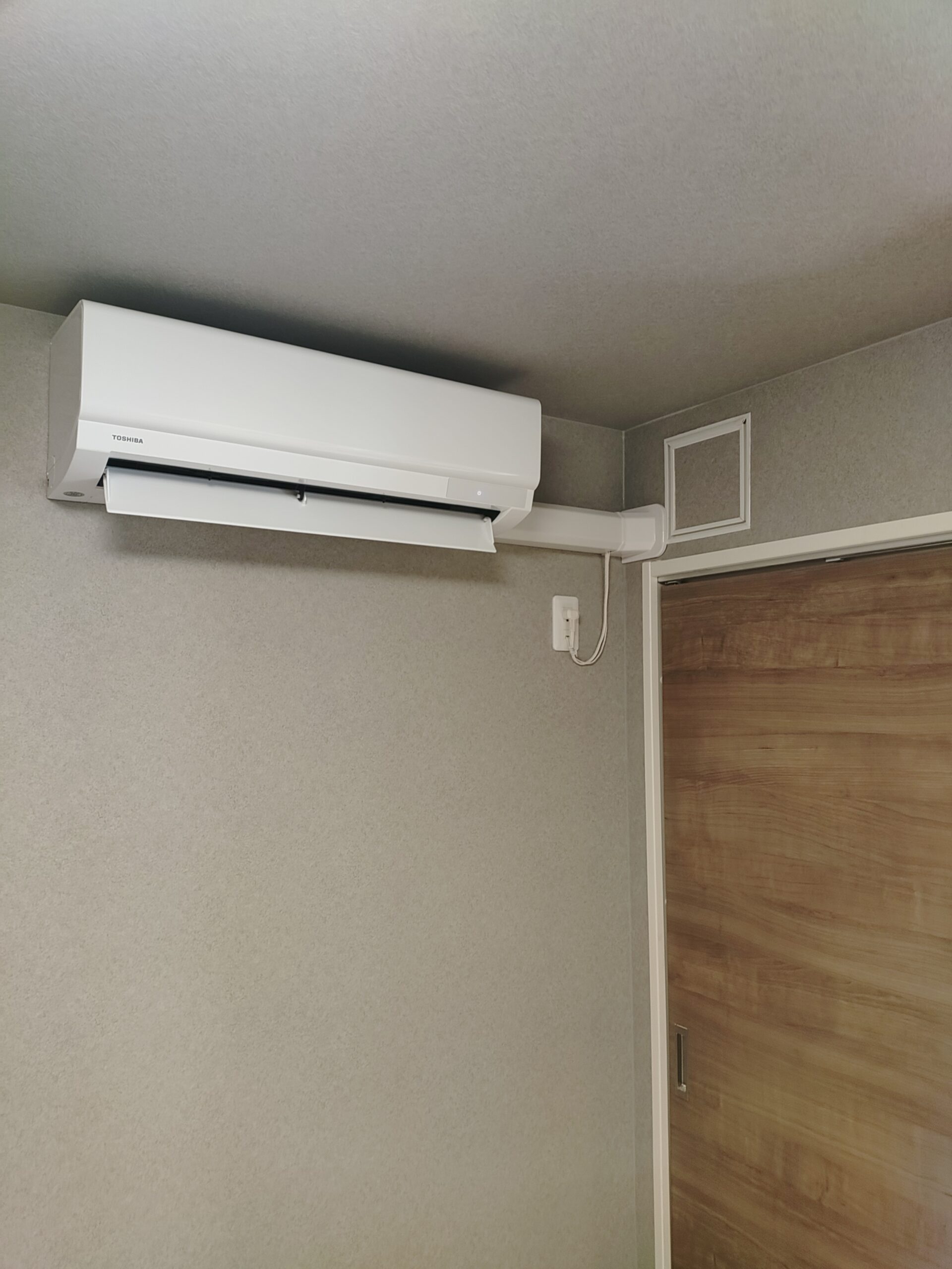 ルームエアコンの室内機を設置し、室内化粧カバーも設置しました。