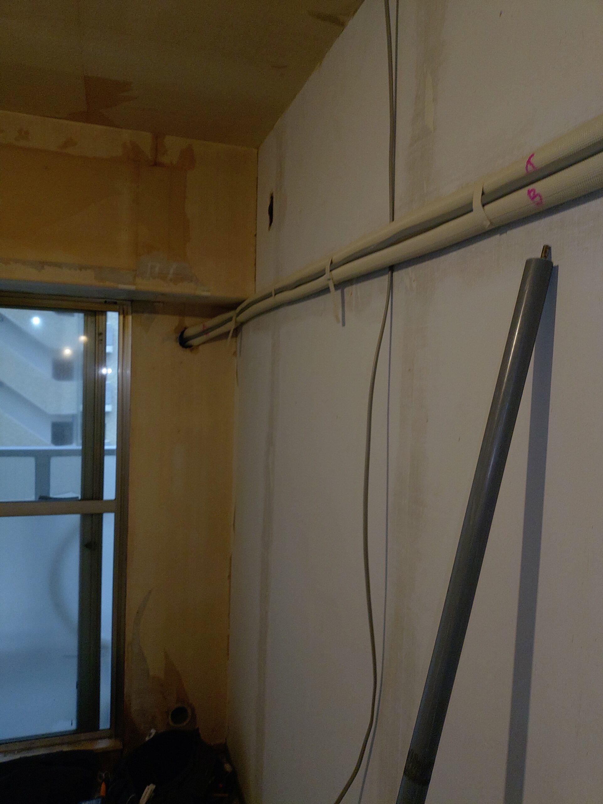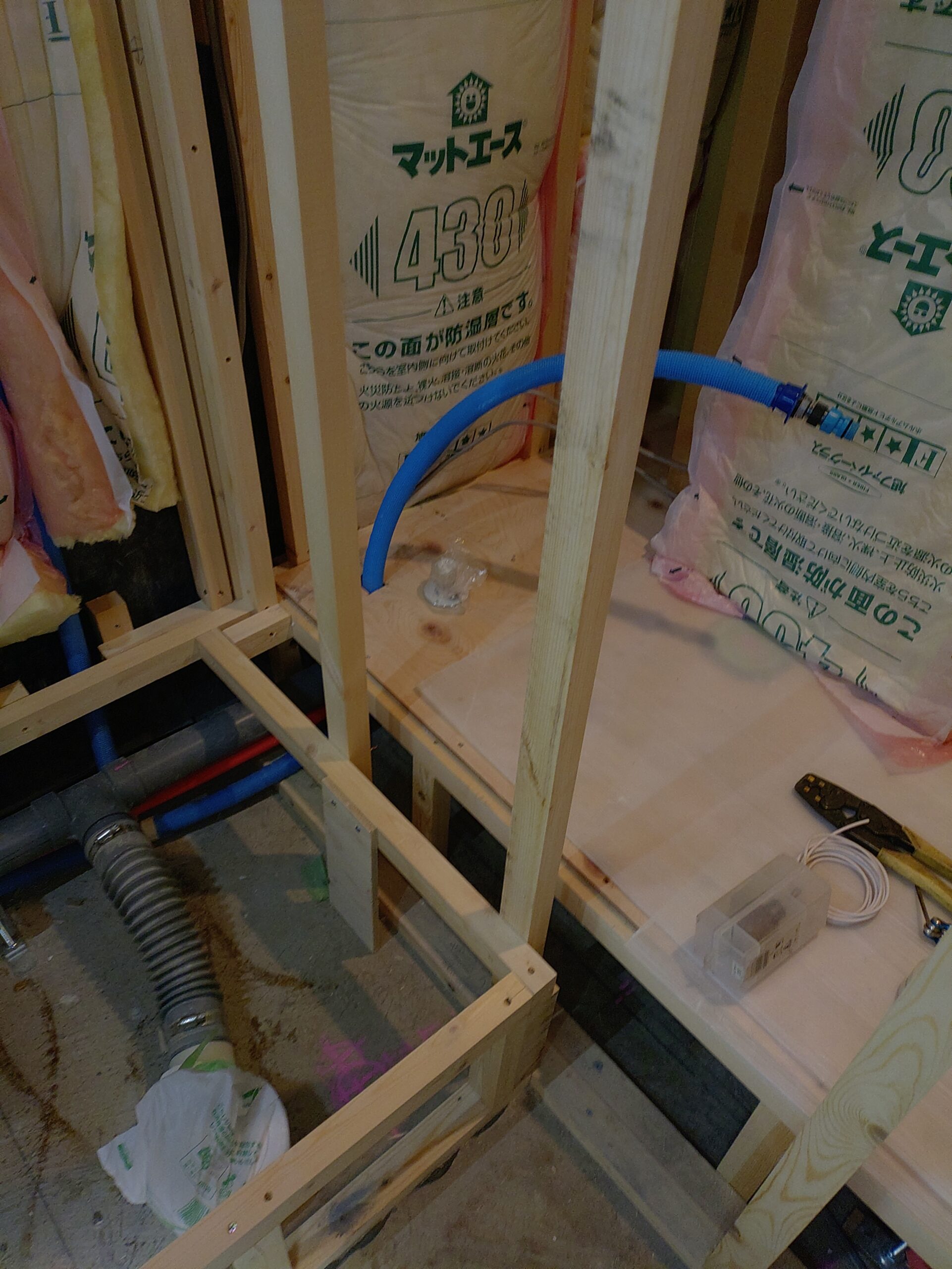 給排水配管と一緒に切り回ししたエアコン用の冷媒配管(2/3ユニオン)・ドレン配管(断熱ドレン・ドレンカフス)を接続・設置しました。
