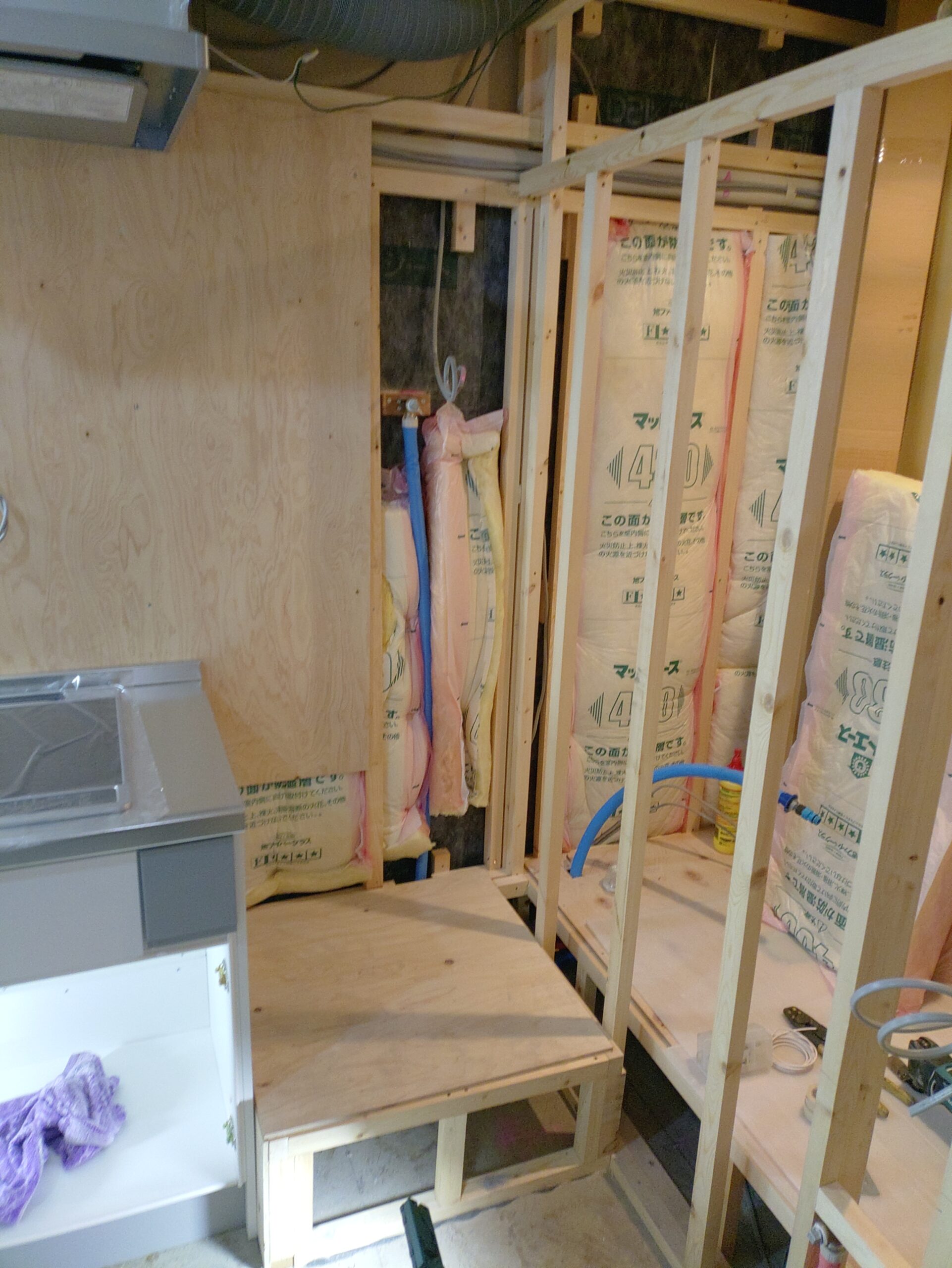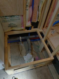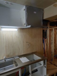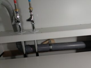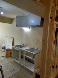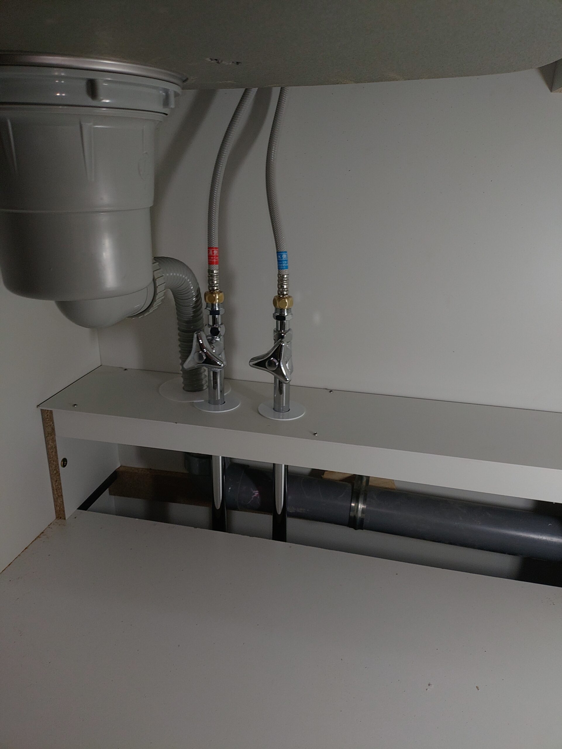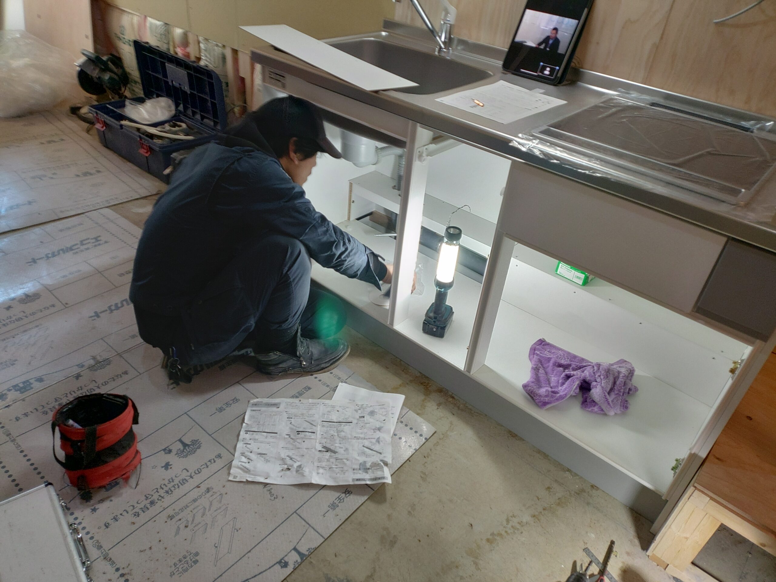 キッチン本体を設置して、切回しした給排水配管をキッチン本体と接続します。