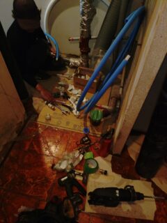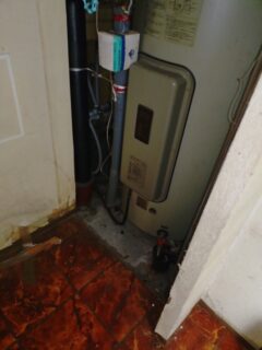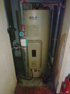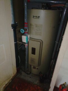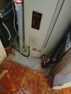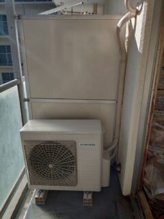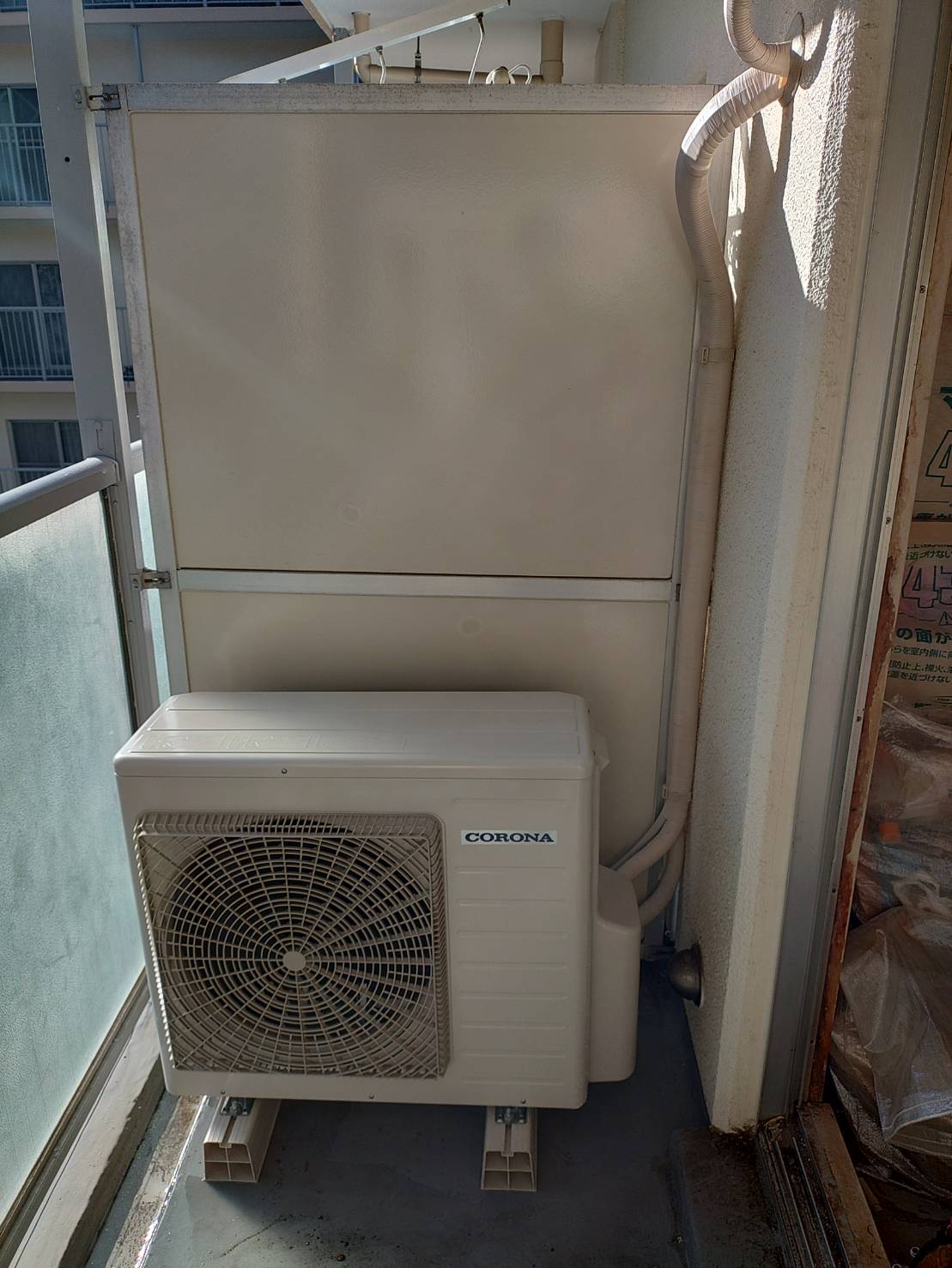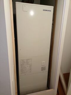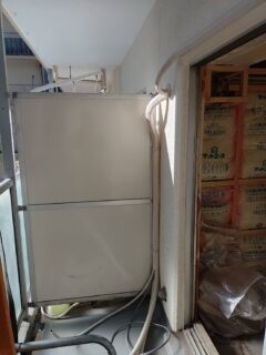 給排水管の切回しがおわったらタンクユニット(貯湯ユニット)・ヒートポンプを設置・固定をします。